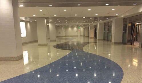 9、抛光:分别用装有树脂磨片的高速地面研磨抛光机对地面进行双向抛光处理。